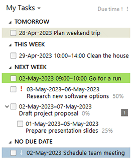 You can customize the way your tasks are displayed by changing their sorting order and adjusting the grouping by dates to fit your preferences.